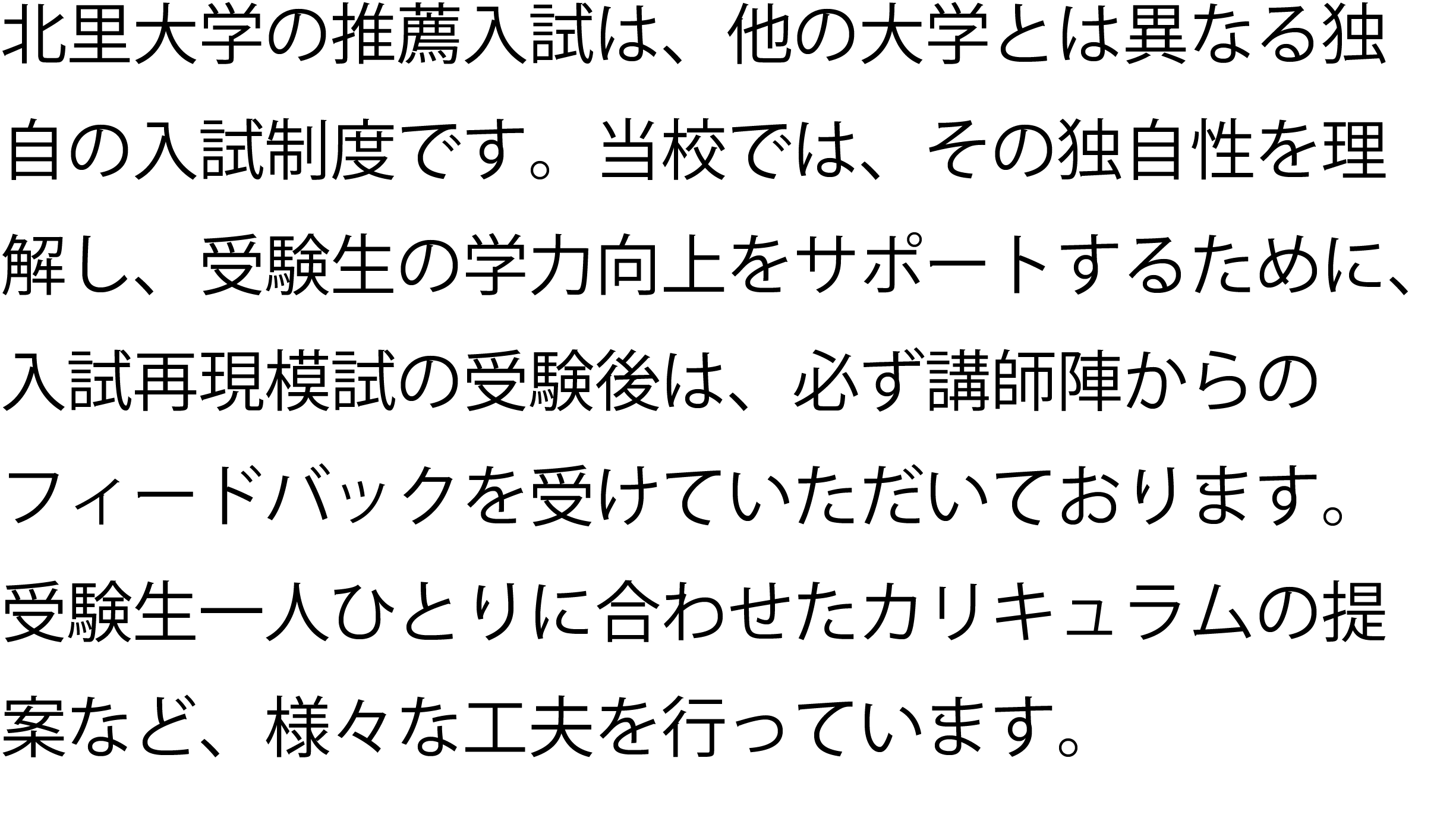 学校との両立が難しい現役生には、週3日の予備校通いをお勧めしていますが、個人に合わせた調整も可能です。限られた時間を集中的な学習に充て、効率的な受験勉強を実現しましょう。