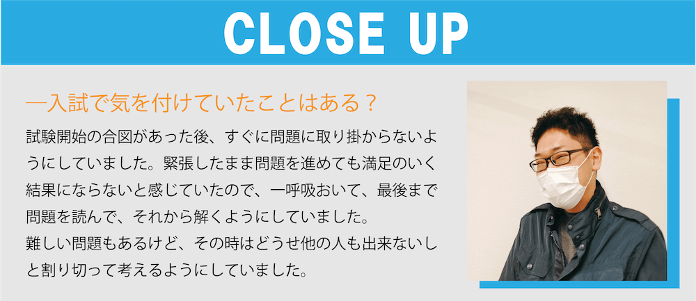 3浪目に生物と数学が伸びたので、今年は化学に力を入れていました。全体的に戦える学力が付いてきたと感じていたので、日頃から本番を意識して、時間を計ったり、本番と同じ紙の大きさで過去問を解いたりして、勉強に取り組んでいました。
