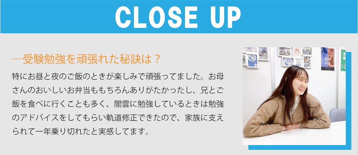 10月ごろから推薦入試に向けた課題を出してもらい、推薦に向けた勉強が出来たのもとても有意義でした。