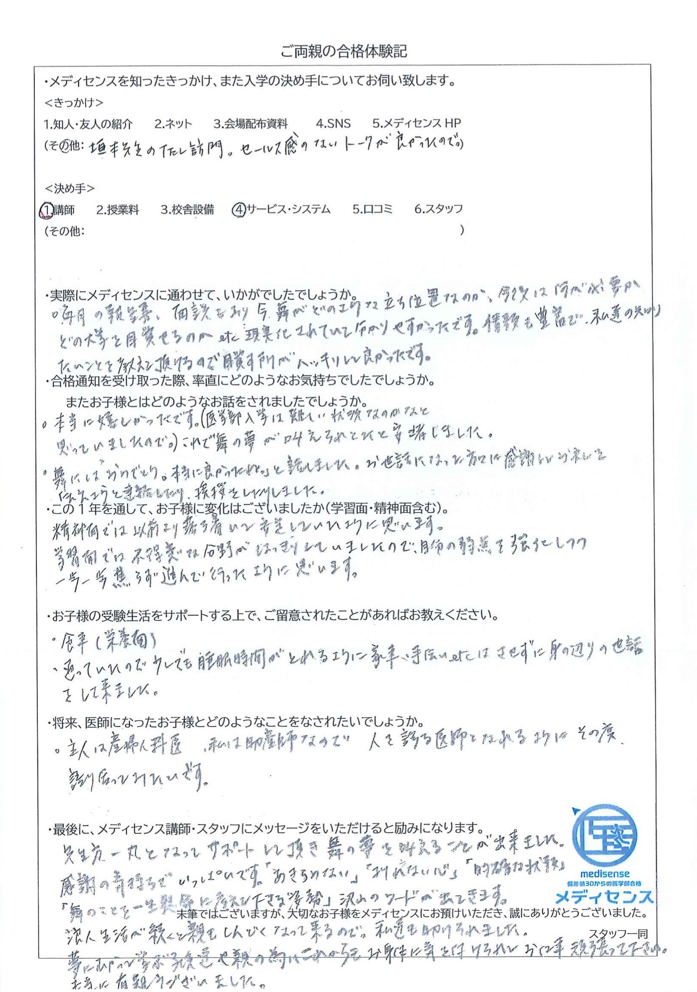 メディセンスでは、毎月の報告書や面談があり娘がどのような立ち位置なのか、今後は何が必要か、どの大学を目指せるかなどを知ることができて安心して通わせることができました。東京にも校舎があり、情報も豊富で私たちの知りたいことを教えていただけました。