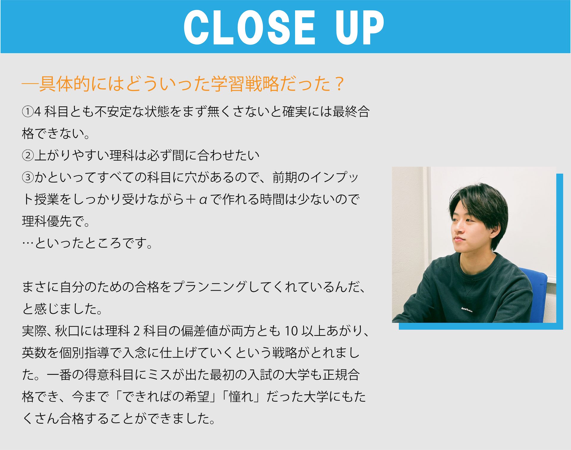 入校前学力診断のフィードバック時から、科目ごとに今やるべきことが明確に提示されて、その道筋に乗っかっていけば今年こそは絶対合格できるという自信を持てたので入校を決めました。