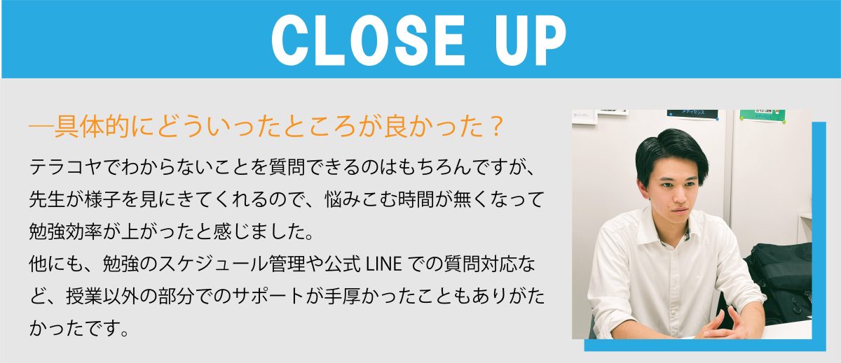 家から校舎まで二時間近く離れていたので、週3は校舎で勉強・週4は家で勉強していました。校舎に登校する日は授業はもちろん、テラコヤの時間も最大限活用して学習するように心がけていました。