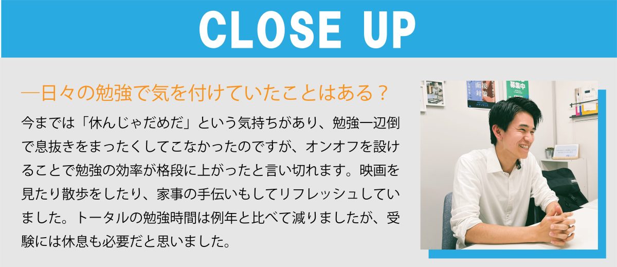 夏頃の模試では成績の伸びを感じることができなかったのですが、受験期直前の模試である程度手ごたえを実感することができたので、その勢いのまま受験に入ることができました。