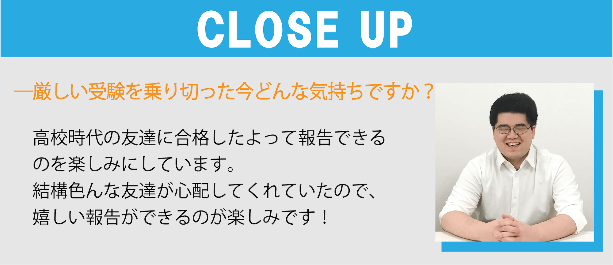 いつも校舎が閉まる直前まで先生に質問していたので、それがようやく合格につながったのだと思います。
