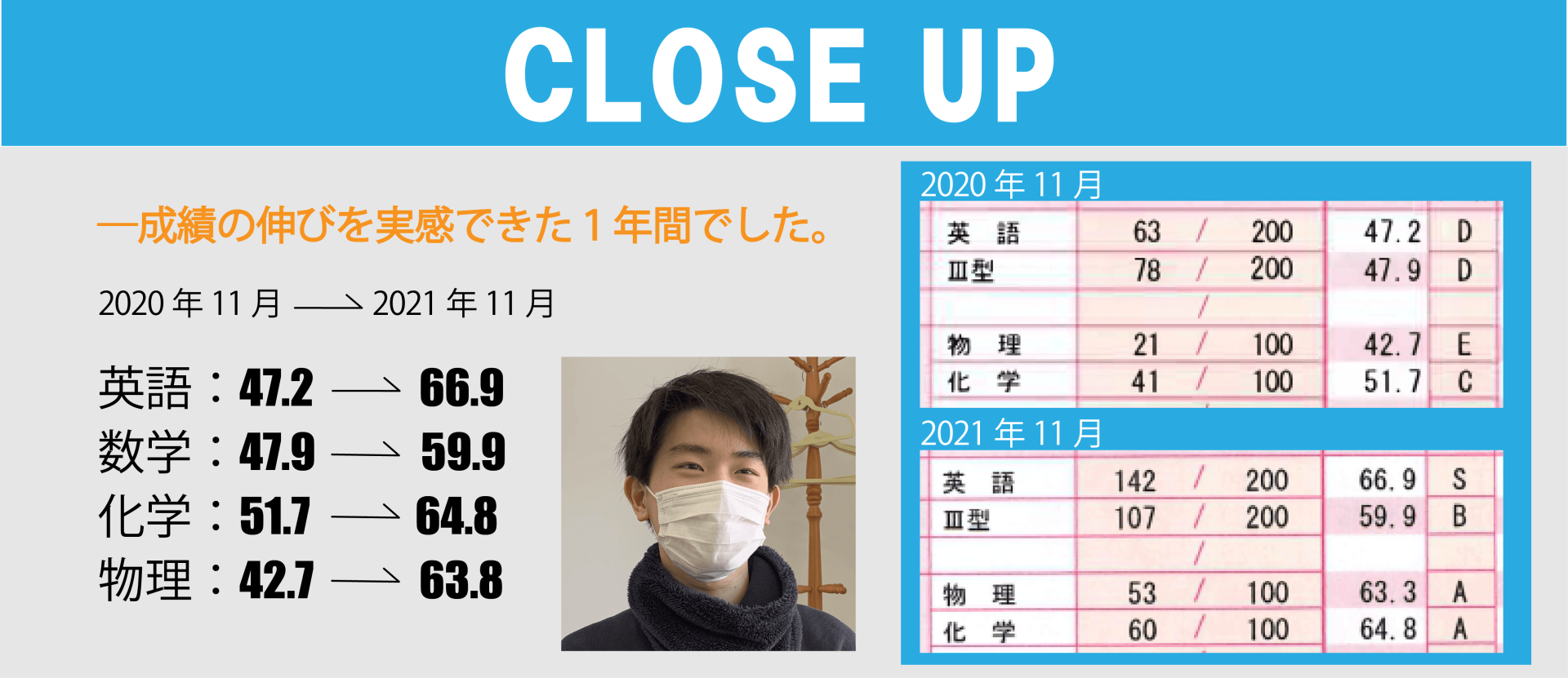 高校では学習は全くしてなくて、何の知識も無かったのですが、体験授業で丁寧に教えてもらったり合格までの道筋を明確に提示してもらえたことが、入学の決め手になりました。
