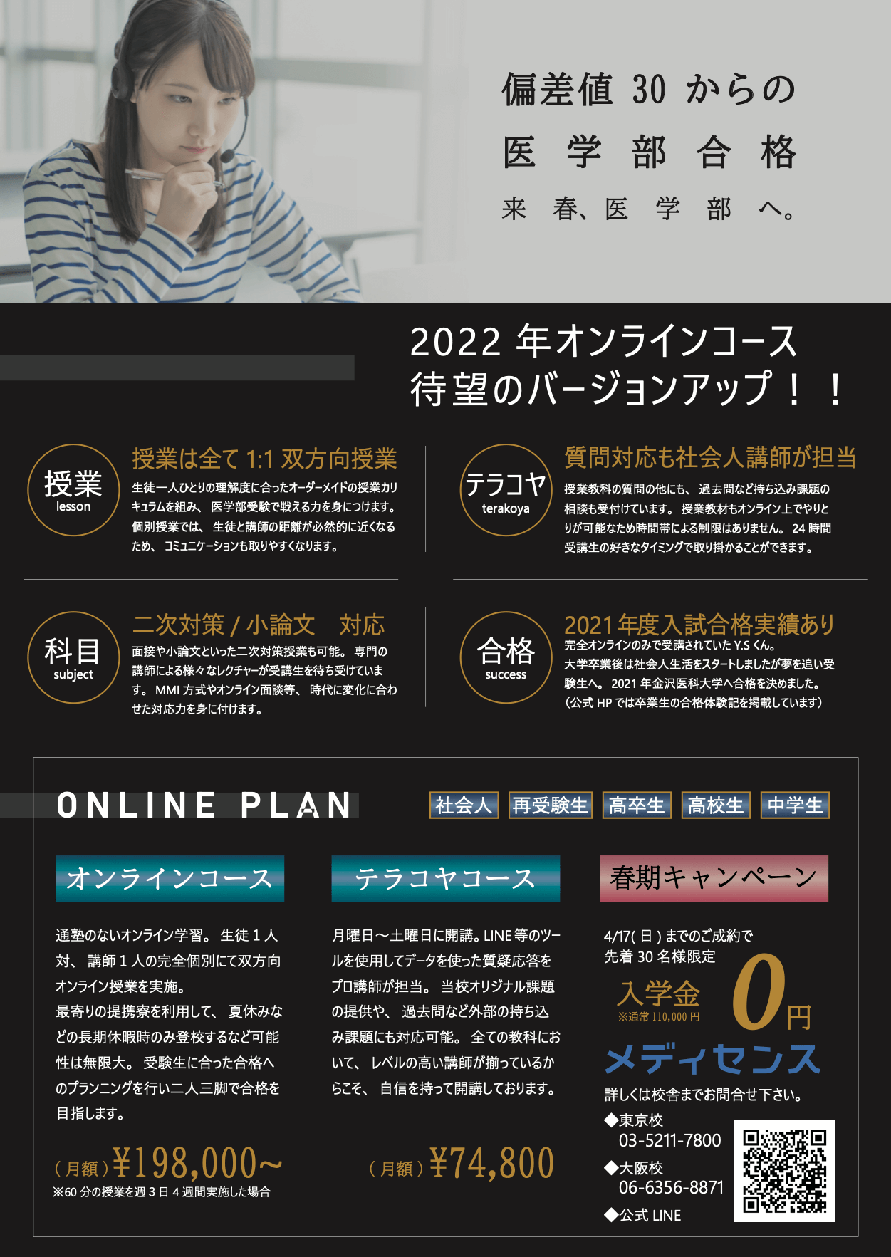 メディセンスでは、既に昨年12月に完全オンラインコースで今年度入試の最終合格を決めている生徒もおります。