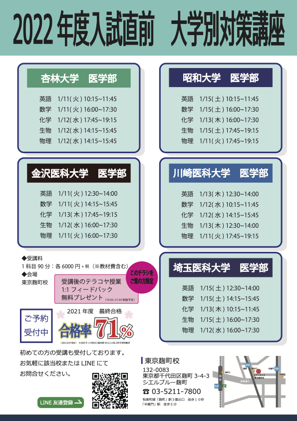 東京麹町校では、下記大学ごとの入試直前講座を開講致します。