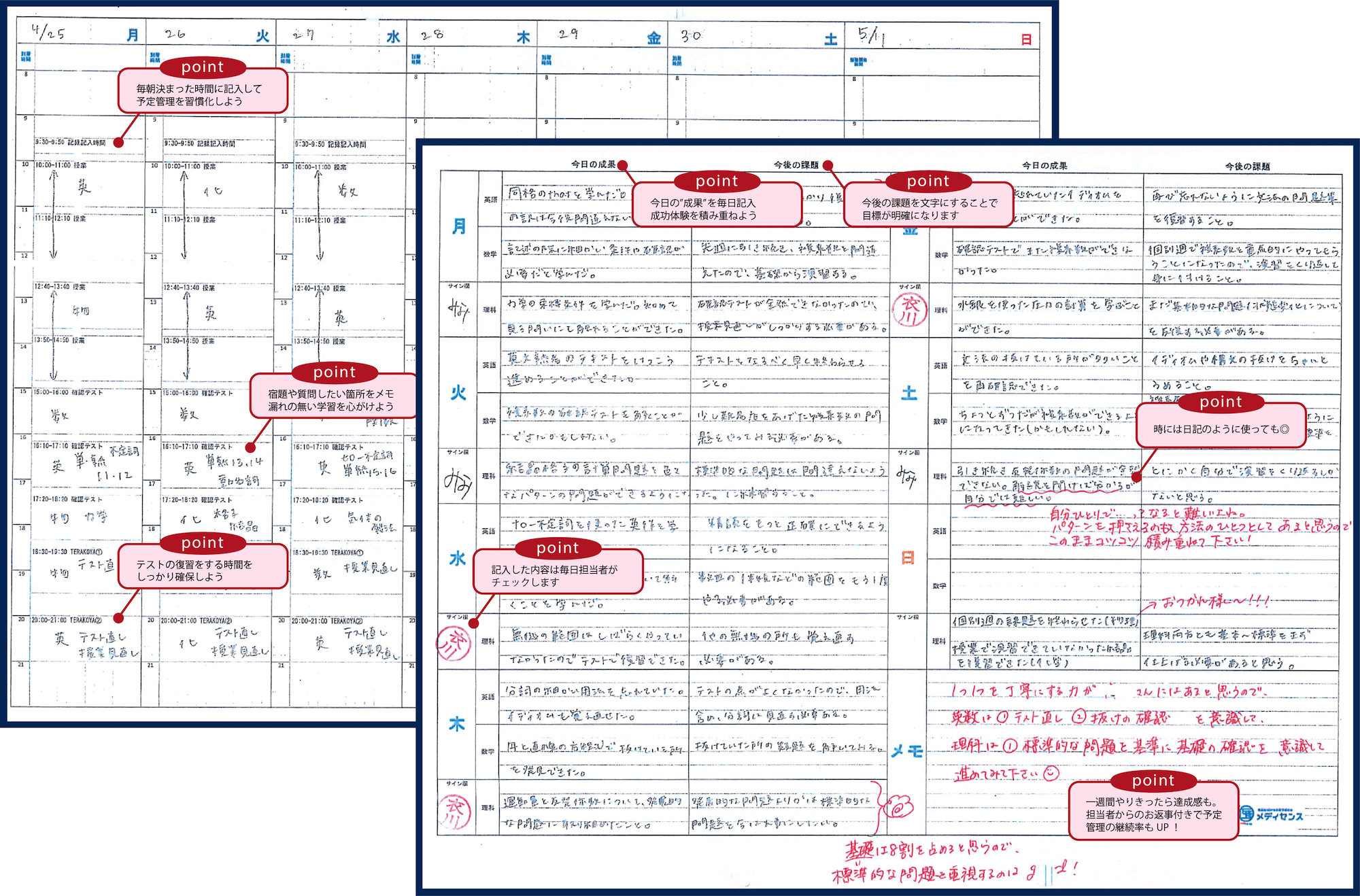 生徒自身も学習記録をつけ、自分自身の学習状況を把握することは、その後のフィードバックを受けて、次のステップへ進むための重要な基盤となります。